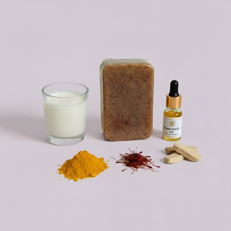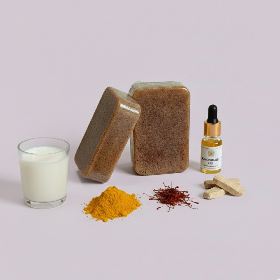Indulge in the purity of Ayurveda with our 100% natural soap, enriched with sandalwood, saffron, Haldi, Goat Milk, Kumkumadi oil, Mulethi, and Chandan.